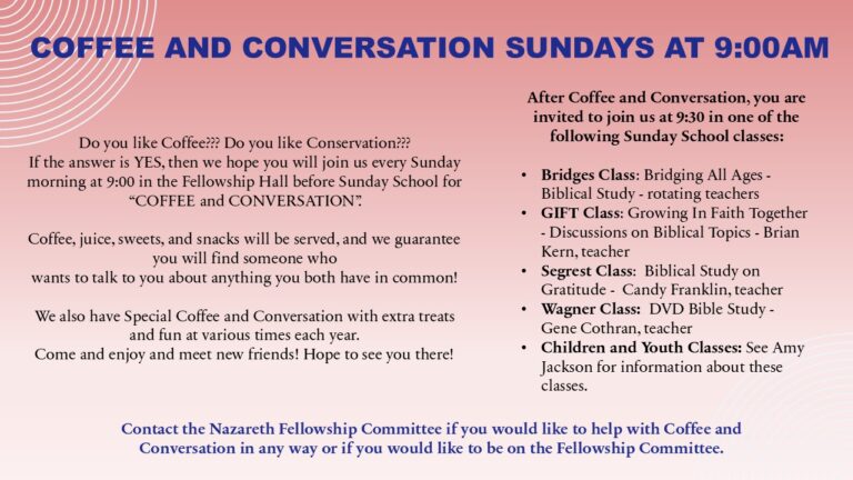 You are also invited to worship with us anytime by viewing our services on our Nazareth You Tube channel.