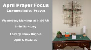 Join us Wednesday mornings in the Sanctuary at 11:00 am during the month of April as we spend time in Contemplative Prayer led by Nancy